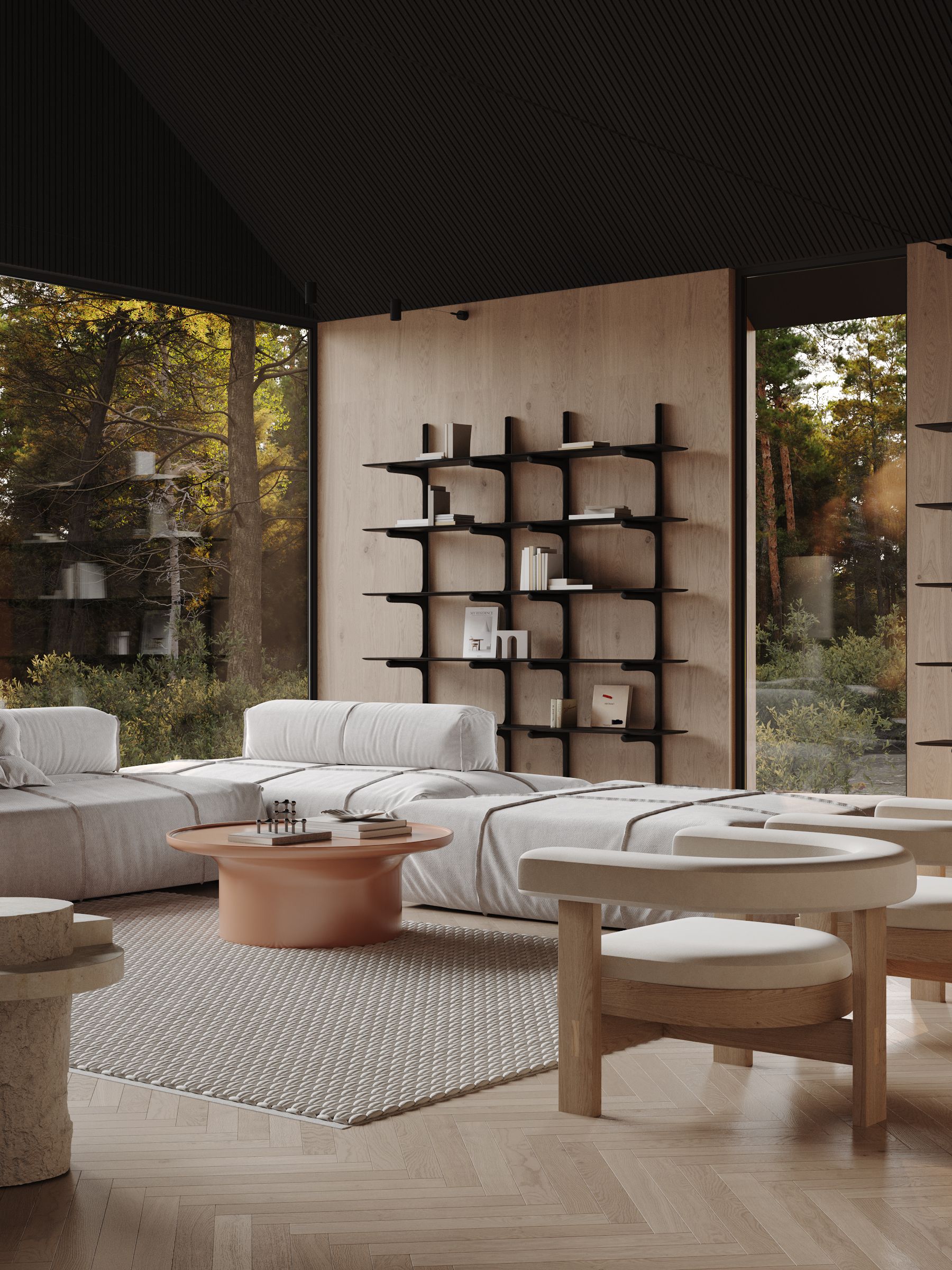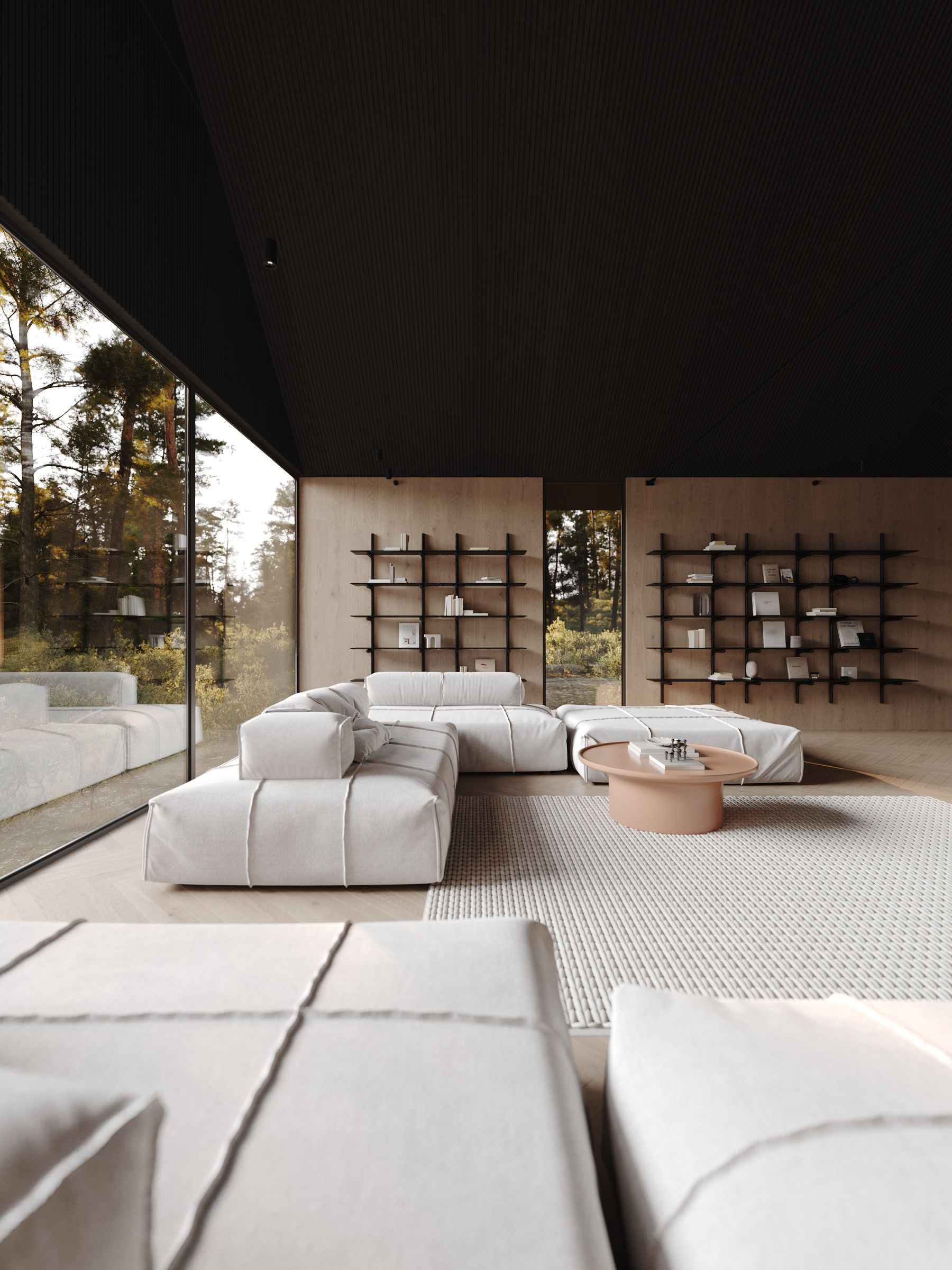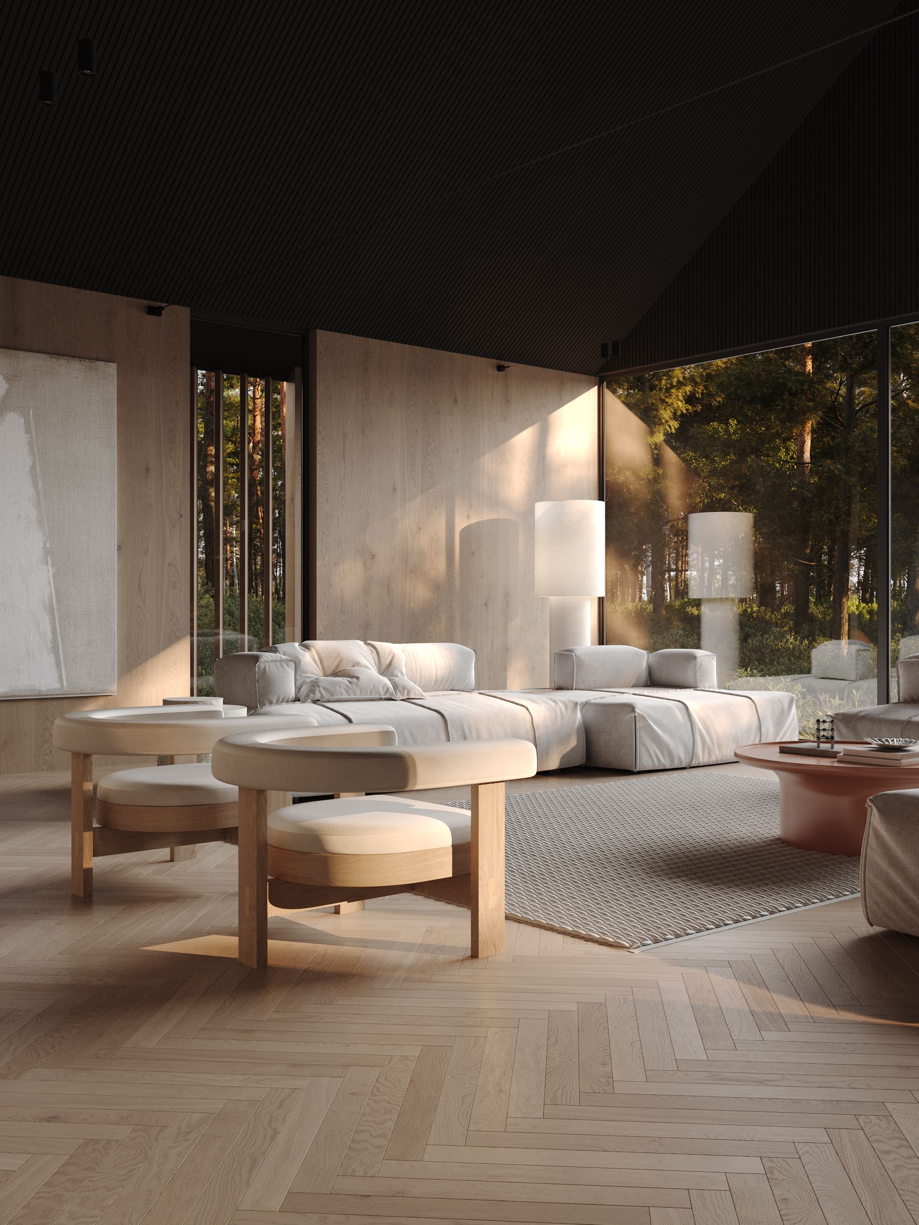 Overall, the forest house with panoramic windows and modern minimalist interior design creates a space where people can enjoy the beauty of nature and live in comfort and harmony with the environment.