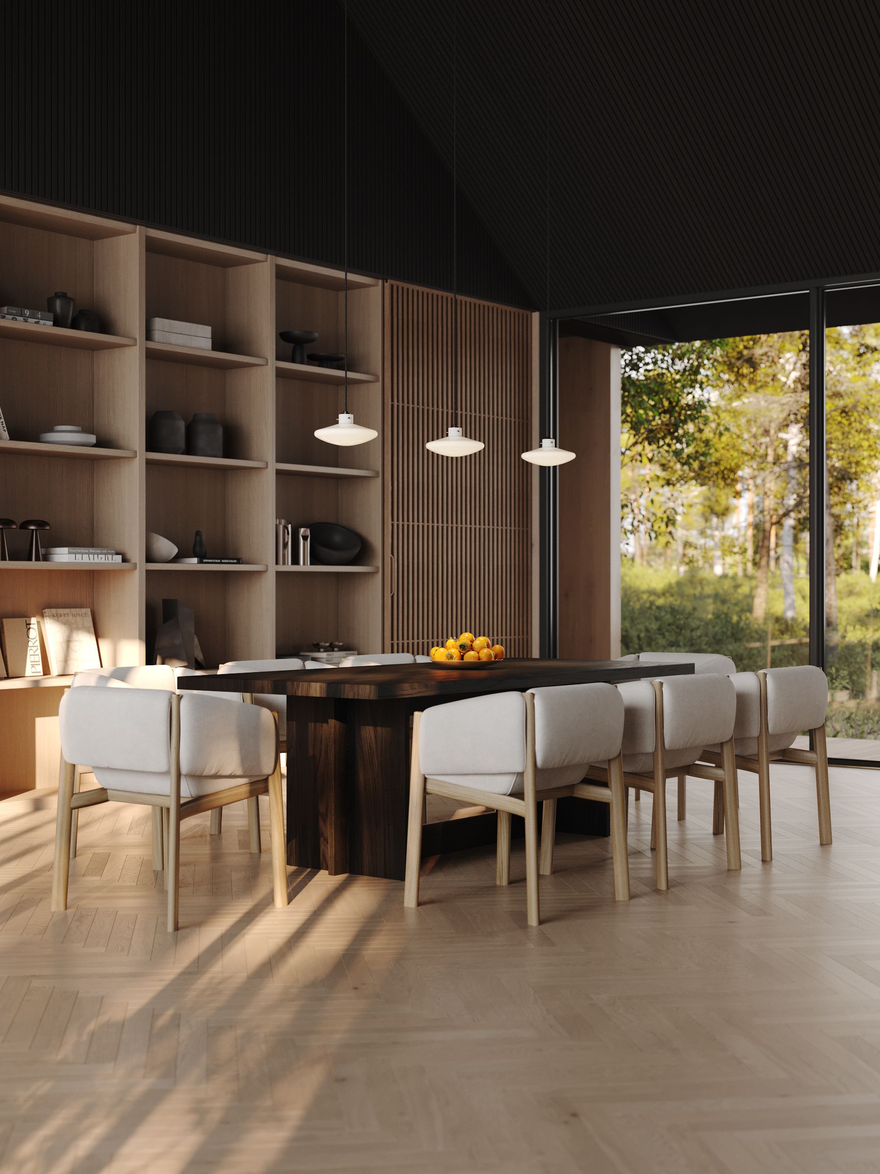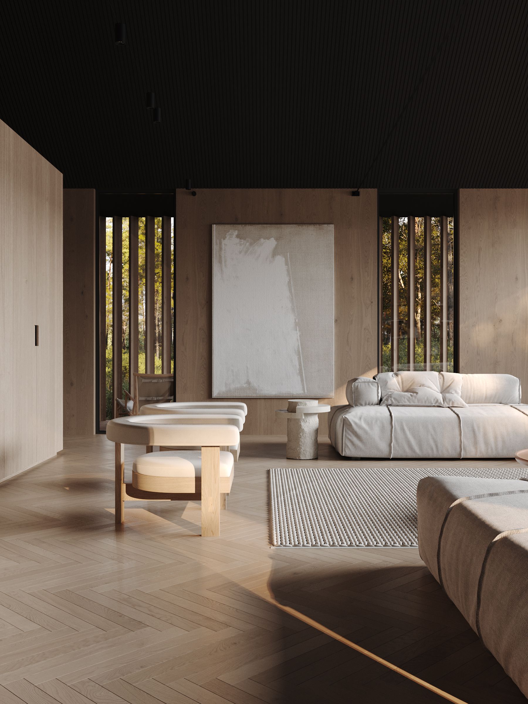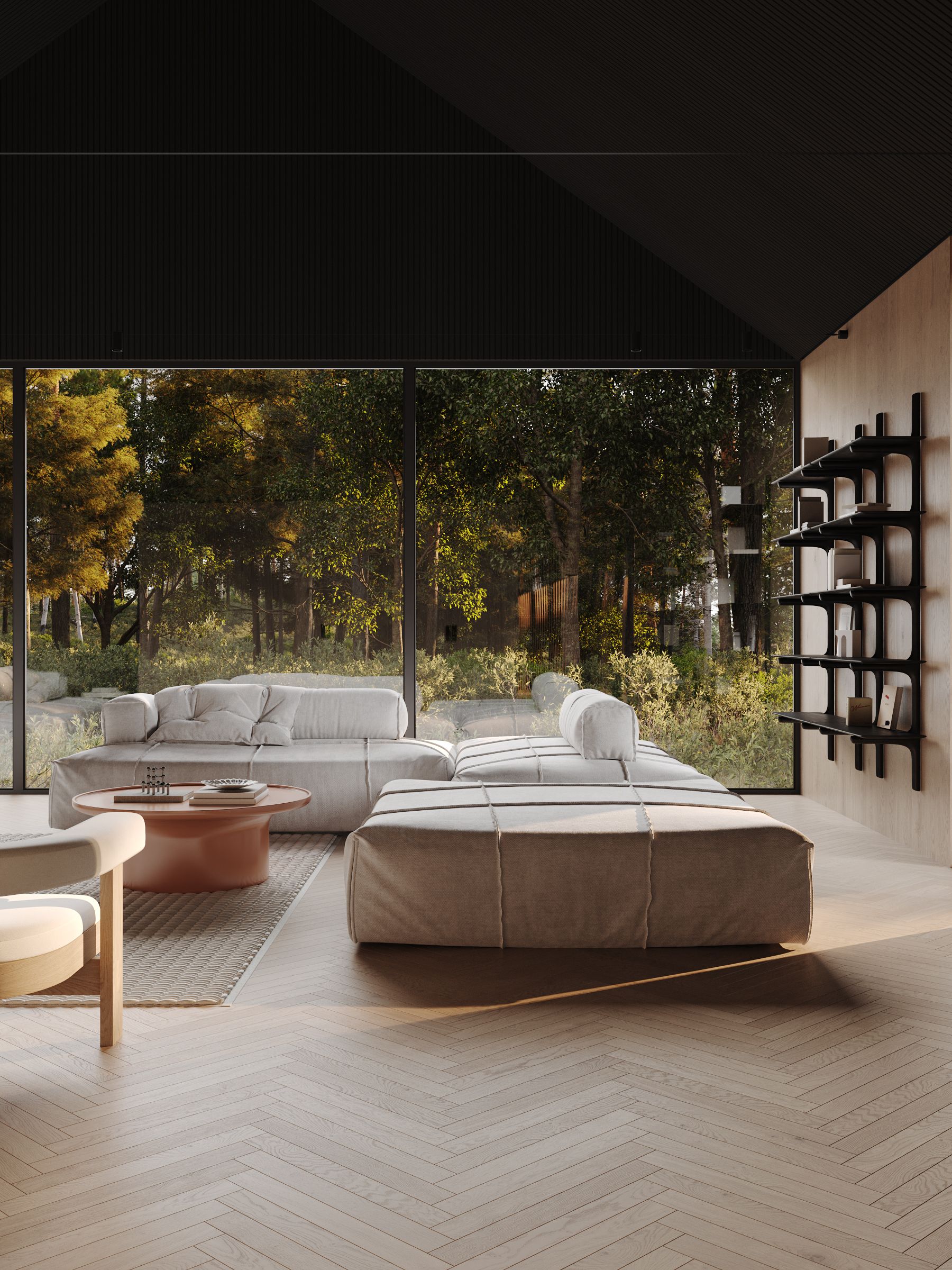 Overall, the forest house with panoramic windows and modern minimalist interior design creates a space where people can enjoy the beauty of nature and live in comfort and harmony with the environment.