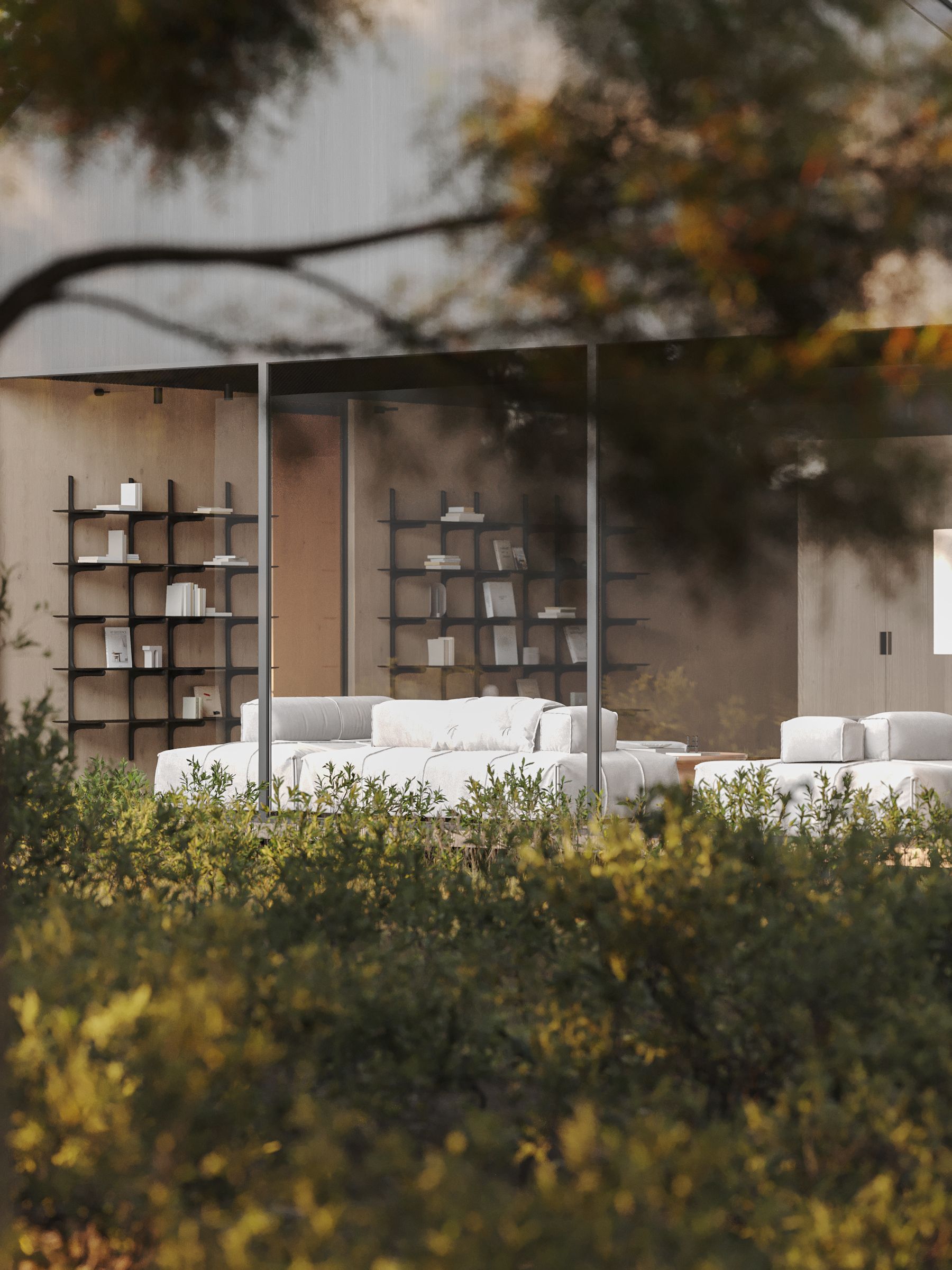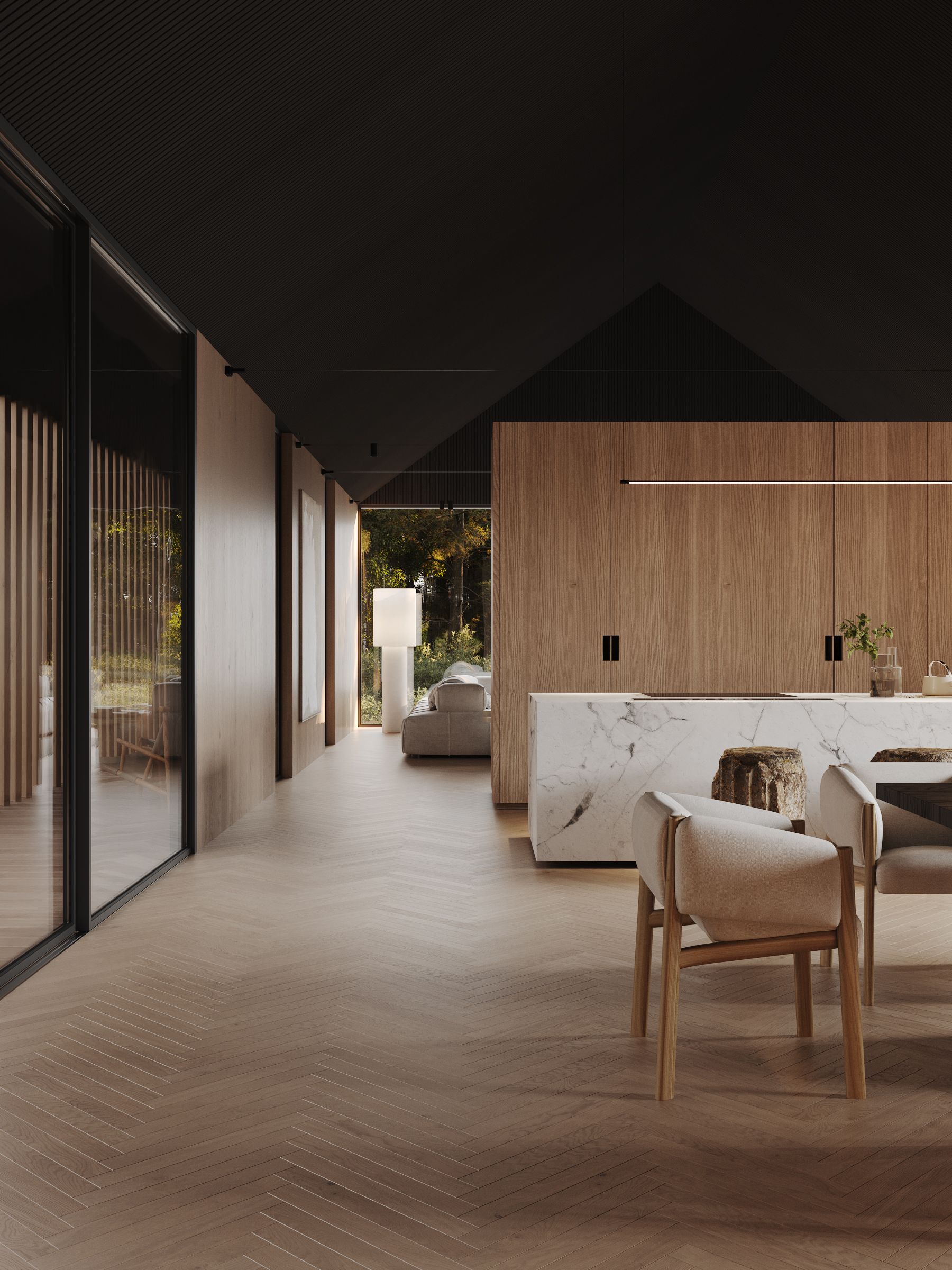 The space of the house is divided into open areas, including living rooms, dining room and kitchen. The placement of furniture and accessories is planned in such a way as to make maximum use of the advantages of panoramic windows and create a comfortable space for relaxation and entertainment.