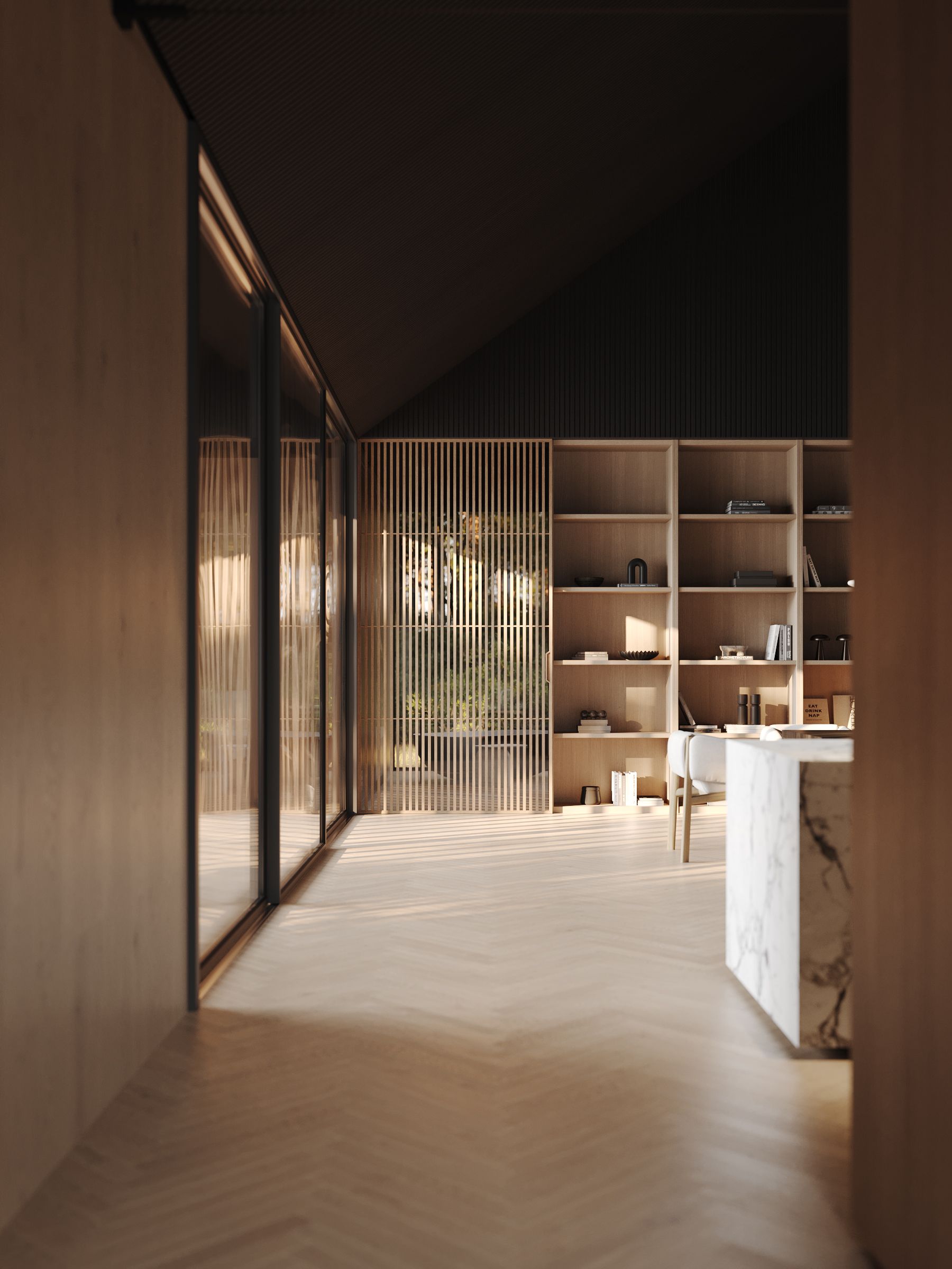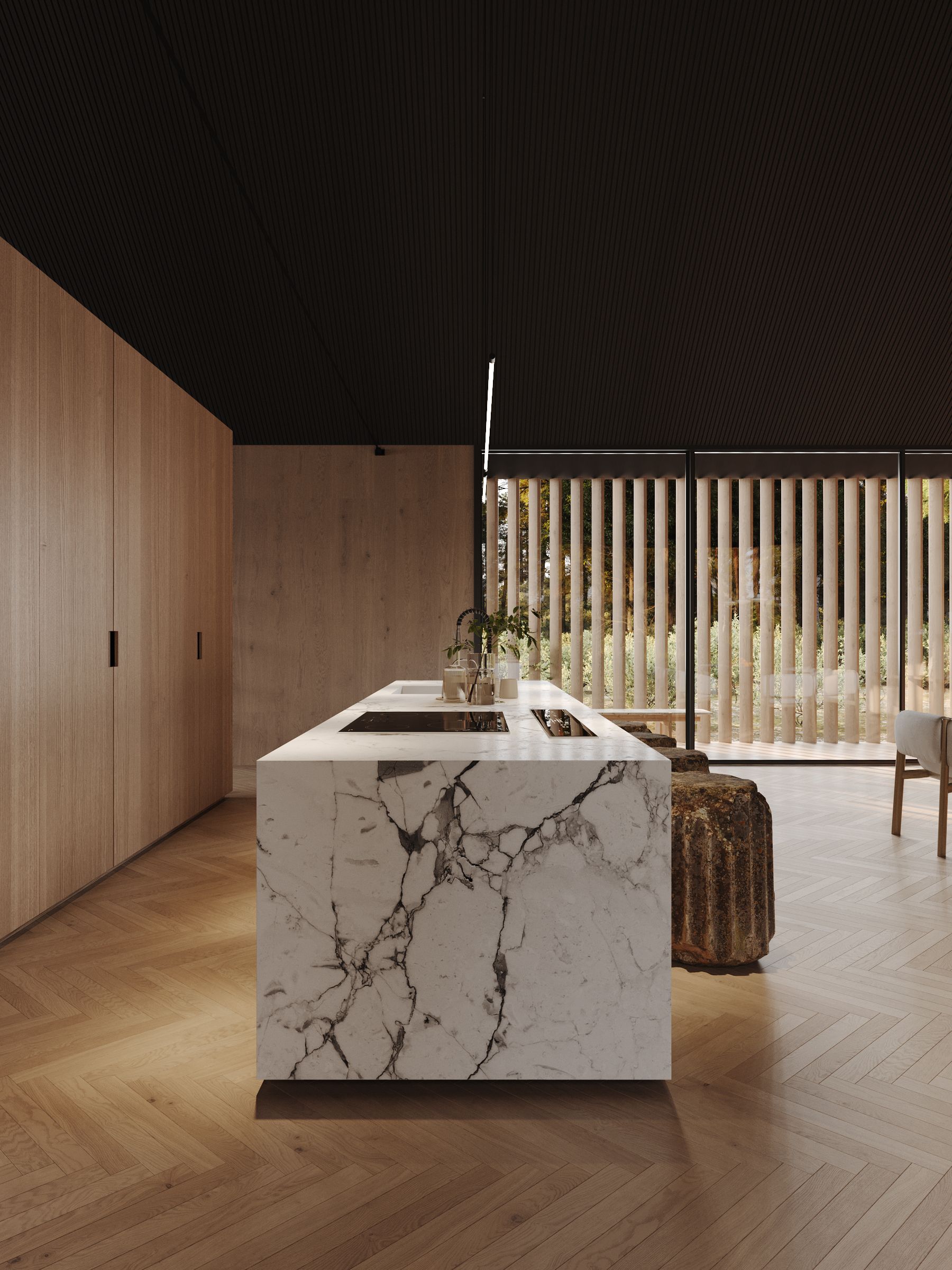 The interior is based on the principles of minimalism. Clean lines, simple shapes and a neutral color palette create an atmosphere of calm and harmony. The furniture and accessories are contemporary in style, and the surfaces and finishes are made from natural materials such as wood, stone and glass.