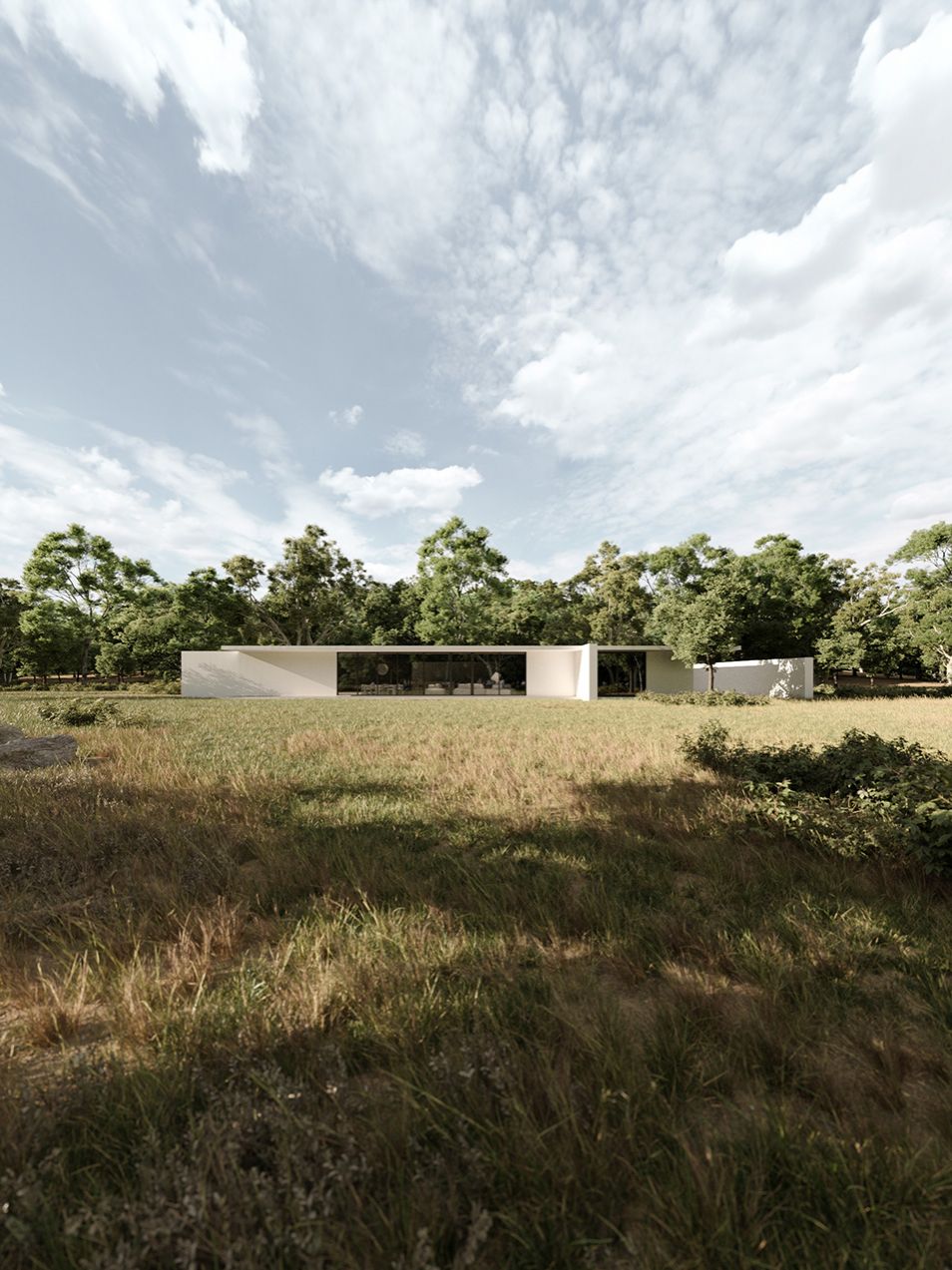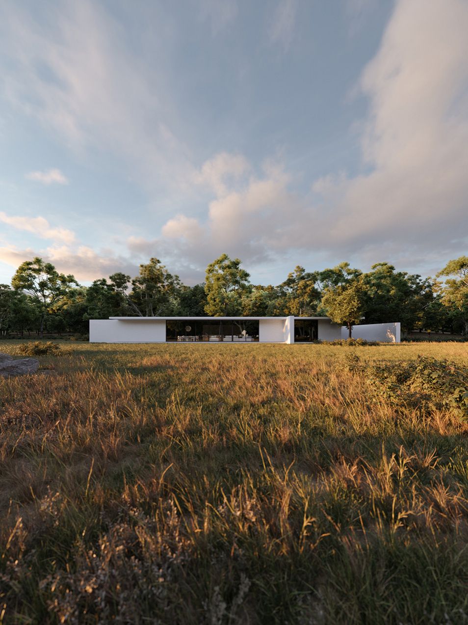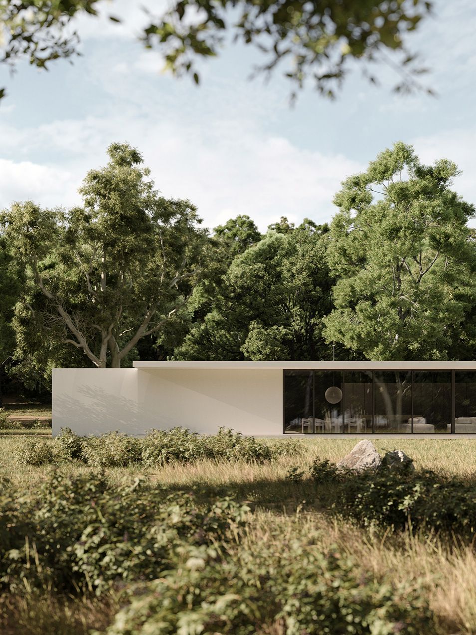 The minimalist and modern house is for relaxation and parties and is located away from the city near a wooded area and a lake. Delicately integrated into the natural context, the volume blends seamlessly into its surroundings. A curious corridor, which leads to the private courtyard, is created by the geometrically simple volume of the high wall, and creates privacy and a feeling of complete safety. The interior design meets all customer requirements and presents a single, bright space as a combined kitchen-dining room and living room with access to the backyard. The home also features two full bedrooms, private and guest bathrooms, and an office.