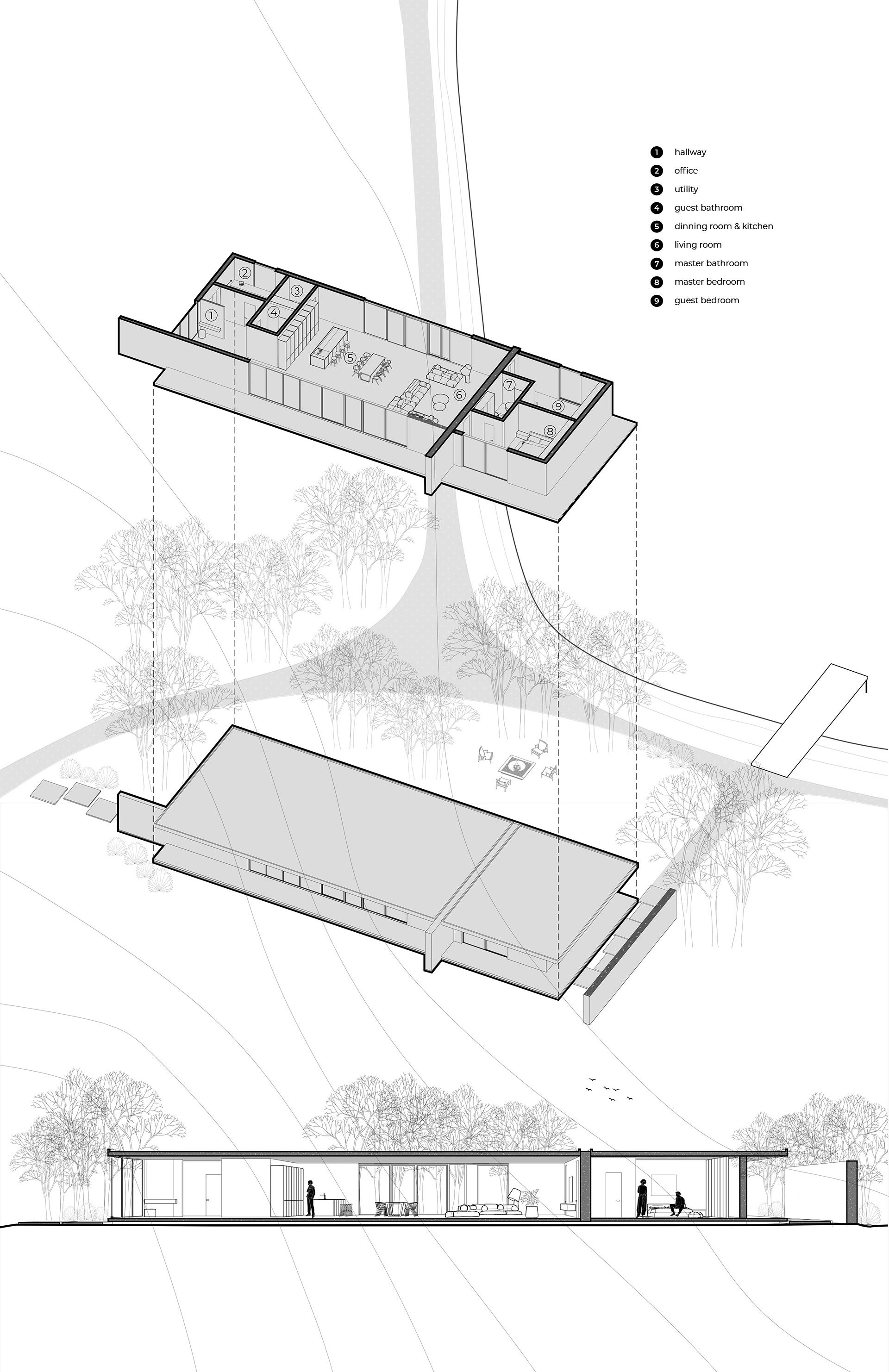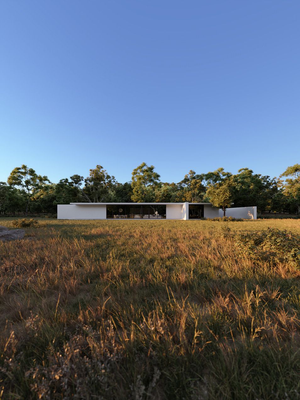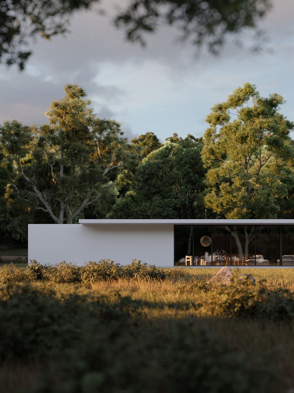 The minimalist and modern house is for relaxation and parties and is located away from the city near a wooded area and a lake. Delicately integrated into the natural context, the volume blends seamlessly into its surroundings. A curious corridor, which leads to the private courtyard, is created by the geometrically simple volume of the high wall, and creates privacy and a feeling of complete safety. The interior design meets all customer requirements and presents a single, bright space as a combined kitchen-dining room and living room with access to the backyard. The home also features two full bedrooms, private and guest bathrooms, and an office.